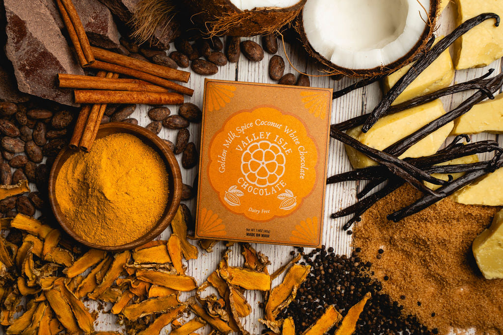Sweet and spicy Vegan-friendly Coconut White Chocolate. Inspired by a traditional Golden Milk recipe and made with our own Maui grown turmeric.